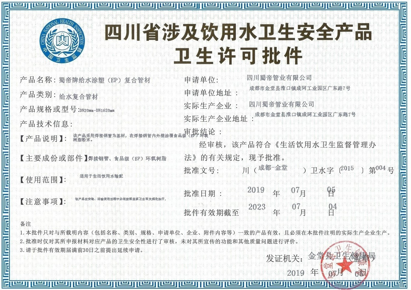 涂塑鋼管衛生許可批件