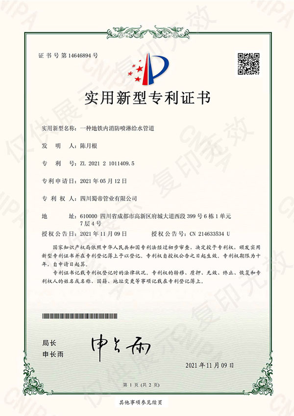 地鐵內消防噴淋給水管道專利